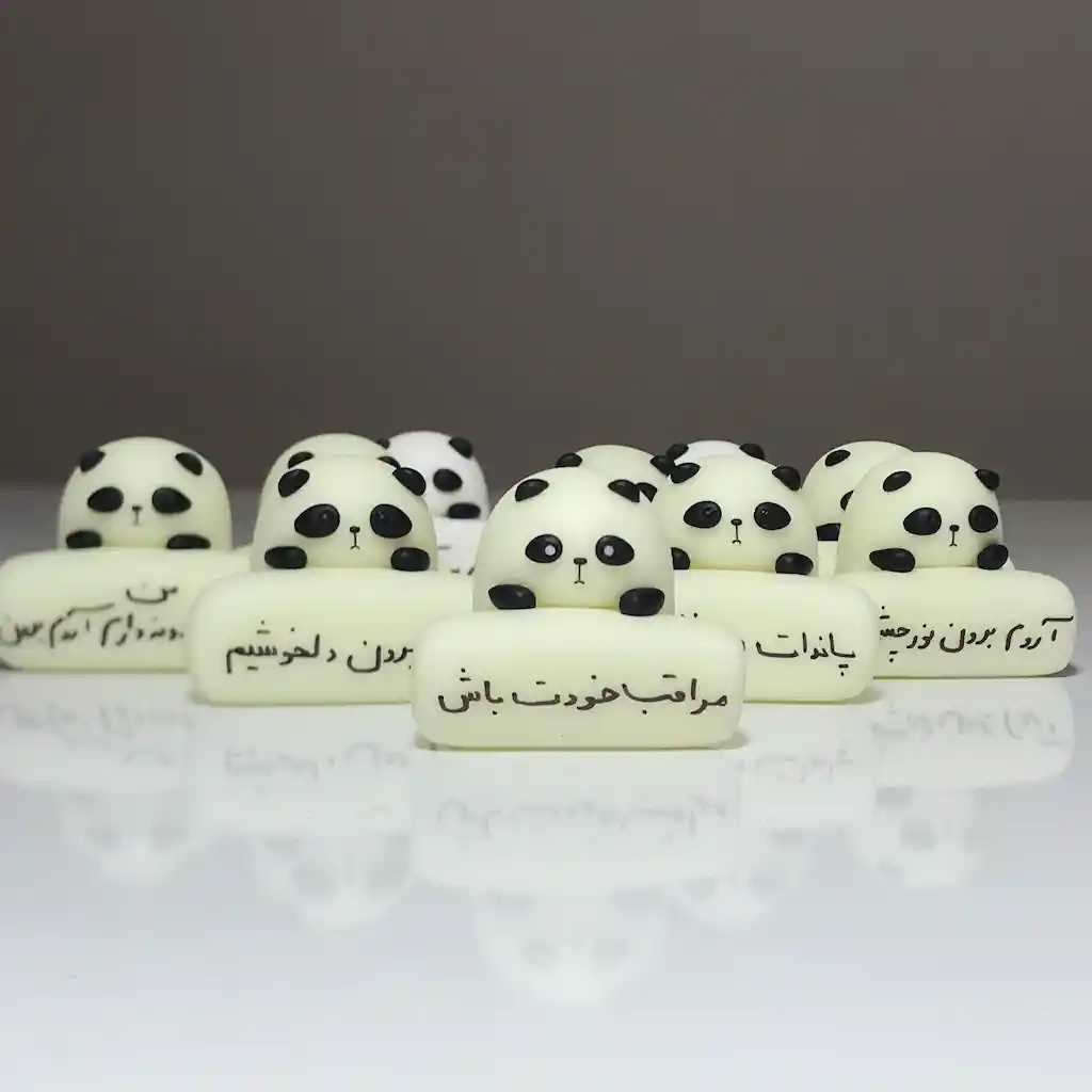 تگ با متن دلخواه: یه تگ خوشگل جلوی هر پاندا قرار داره که میتونید متن دلخواهتون (مثل اسم، یه جملهی بامزه یا هرچیز دیگه) روش بنویسید. این باعث میشه هر پاندا کاملاً منحصربهفرد باشه!