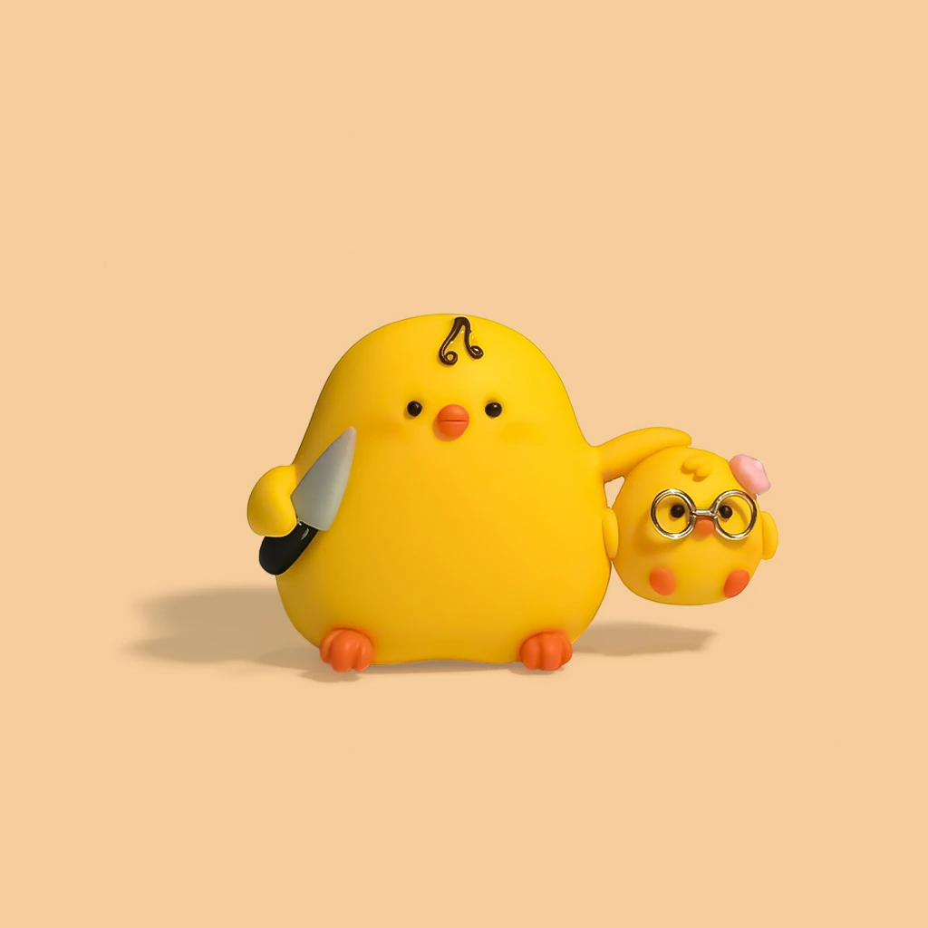 حالت چاقوی کوچیک داخل دست جوجه، کاملاً فانتزی و کارتونی طراحی شده و نشونهی حس محافظت و مراقبته — نه چیز دیگه.